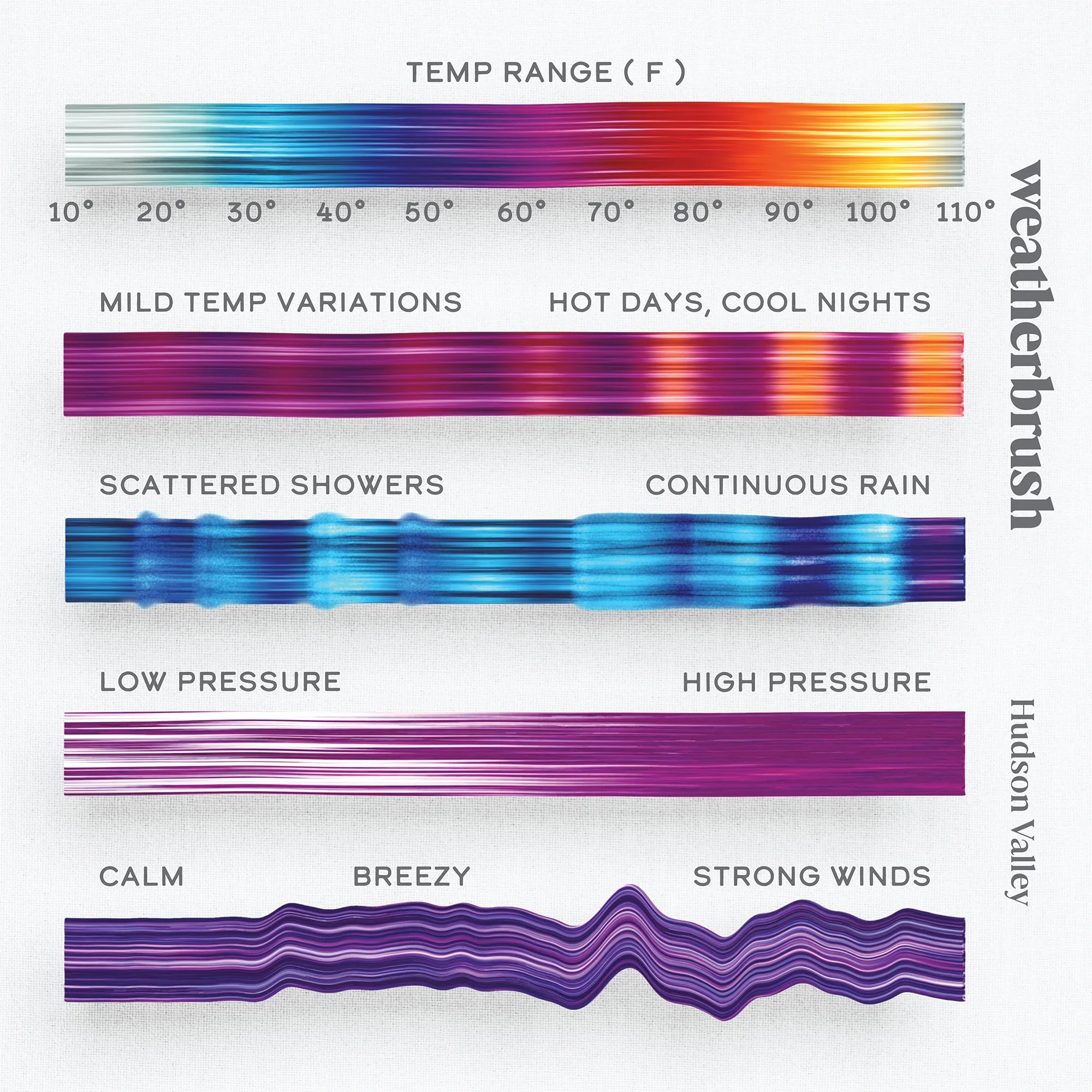 One full week’s weather is represented (left to right) showing 10 weather stations along the Hudson Valley from Albany to NYC (top to bottom). The motion resembles one large brush stroke, but is made of 10 sections independently responding to hourly temperature, wind, precipitation, and barometric pressure.