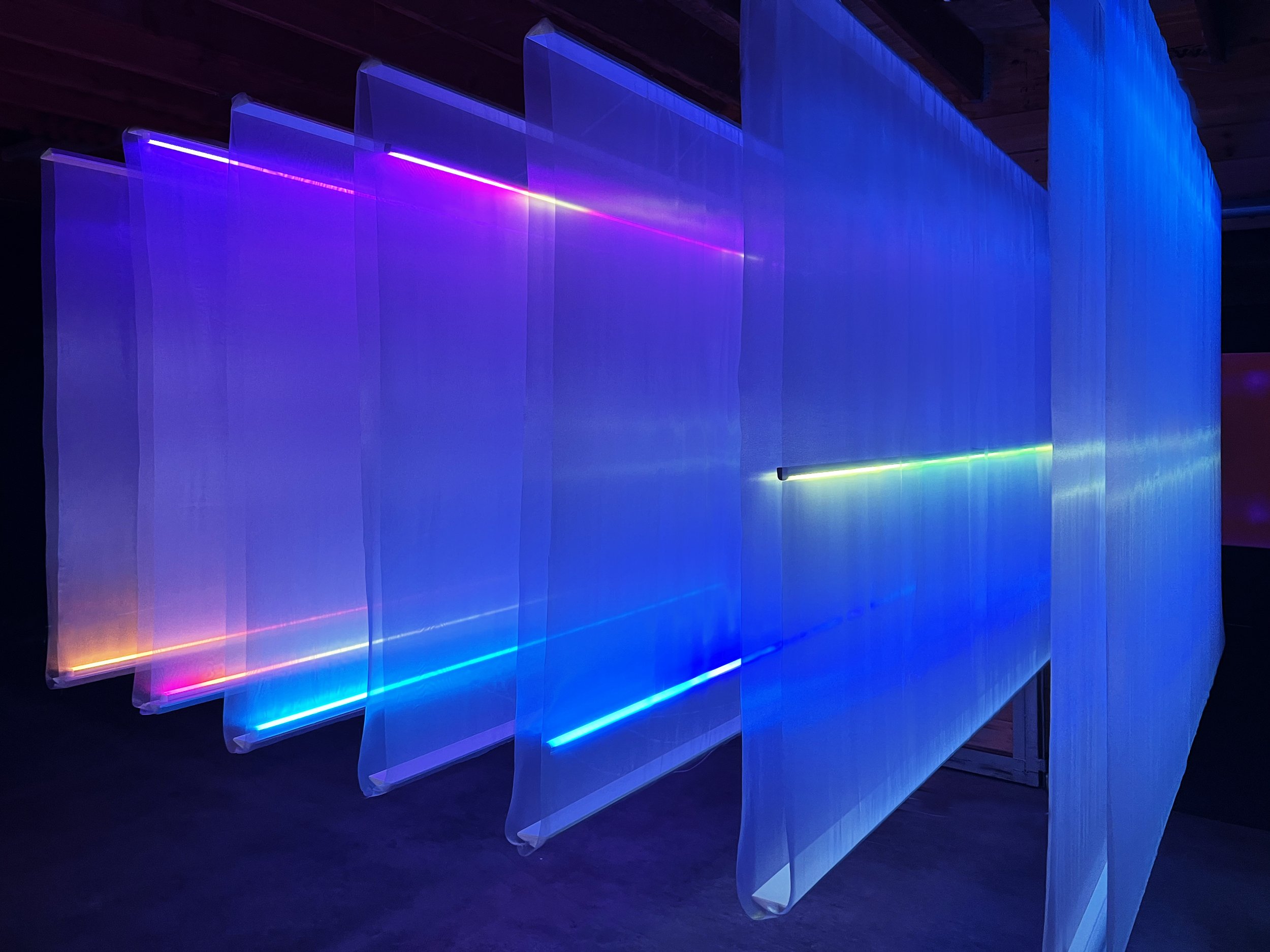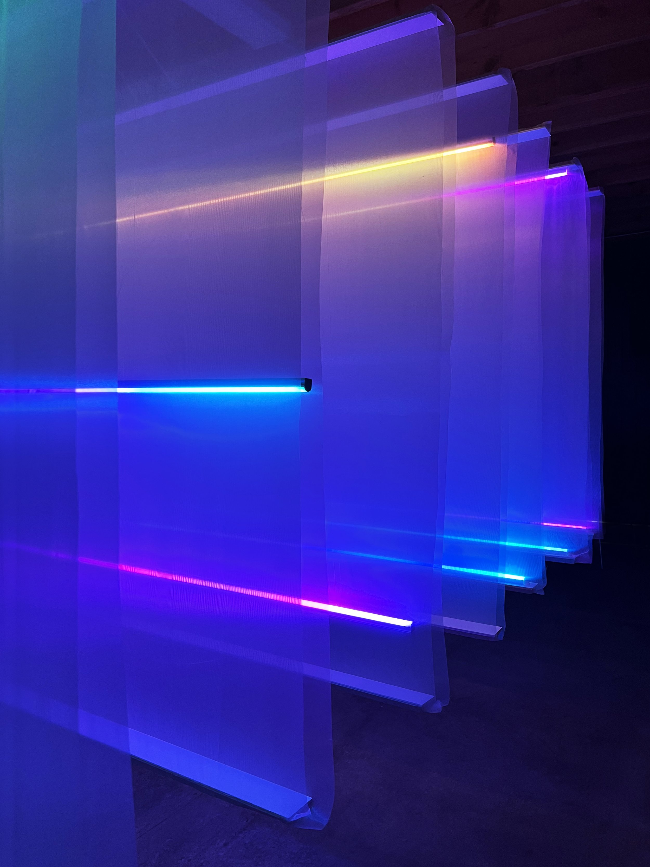 Parallel Tones is a generative light and sound sculpture. This installation consists of a series of interconnected works powered by the same generative, aleatory seeds and cascading data streams. Music triggers shifts in light and the works evolve together, one slow breath at a time.